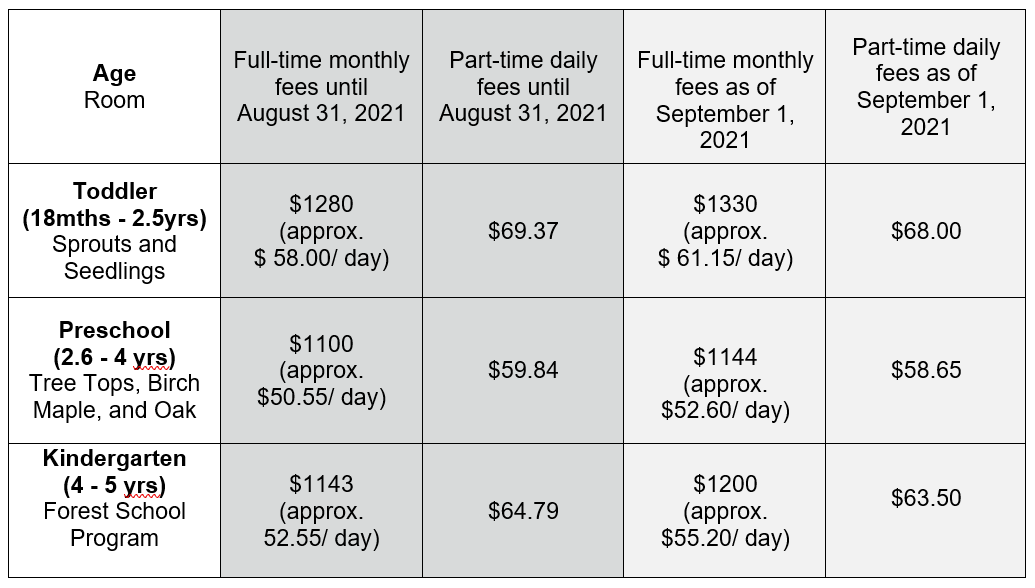 All fees for all age groups will be $22/day based on CWELCC guidelines.